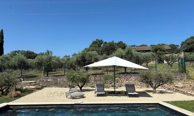 Come relax on a deckchair by our pool, surrounded by olive trees, lavender, and other local scents, with a magnificent view of the Luberon.
