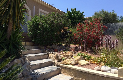 Peaceful, semi secluded, 2 bed villa set in a landscaped garden to the front, side and rear with covered terrace at the front for dining & relaxing, with views across to the adjoining mountains. The side garden & terrace seating/play area, provides room for children to create their own play area. A shaded BBq area, leading to a secluded rear garden terrace and swimming pool.