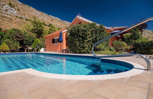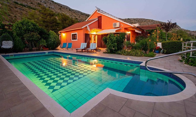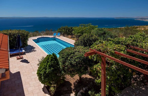 The detached villa is furnished in a modern and luxury style. The property is located on the outskirts. Also due to the view over the sea from the property and its sunny and secluded hillside location the domicile is popular. Available for your exclusive use: parasol, sun lounger, garden shower, barbecue facilities, terrace, pavilion, garden furniture and Hollywood swing.LocationPodstrana, 310 m above sea level. The villa is located on a 1000 sqm enclosed garden plot with flowers, shrubs and trees, bordered by a fence. The landlord does not live in the house or on the property. Villa Aquarius is a luxuriously furnished house with an impeccably maintained garden of approximately 1000 m2. The house is a duplex - it shares a wall with the neighboring house. The gardens are completely separate and due to the location, orientation and good and functional fence you will enjoy privacy. Nobody can see you, you might hear the neighbors next door. If you love and want you can be naked. The property is completely fenced. On the side where the other part of the house is, a completely opaque fence, rich in plants and flowers. The house is located at the end of the village, which gives it a beautiful view of the Split slopes, the sea and the central Dalmatian islands. Also on the north side you have a view of the mountains above the house. The garden is immaculately maintained with Mediterranean plants and flowers, adding to the romantic and intimate atmosphere. Access is via a side road (asphalted). Parking is available on the property, on the street in front of the house and in a parking lot in the village (distance 30 m). Specialair conditioning.Facilities: internet access (WLAN), iron and washing machine. TV reception takes place via satellite. PoolAll pools are available for exclusive use. Outdoor pool (usable from early June to end of September, 4 m x 10 m, depth 1,7 m). Dogsnot allowed. DistancesShopping 3 km, restaurant 3 km, town center 500 m. Children's playground 5 km. In summer: Adriatic Sea 3 km in Podstrana (beach 3 km in Podstrana featuring gravel and bathing plateaus). horse riding in Sinj 30 km. tennis, mini golf, diving each 5 km in Strobec. DivisionVilla, 1 floor, 3 rooms (including 2 bedrooms), 80 sqm, in total 3 beds (including 1 additional bed). RoomThe entrance to your villa is located on the ground floor and leads over 20 steps directly into the hallway. Living room with sitting area, TV, DVD player, access to the terrace and Sea view. Bedroom with 1 double bed and ceiling fan. Bedroom with 1 additional bed on couch/sofa. Cooking nook in the kitchen-diner with dining area, electric stove (ceramic hob, 4 plates), oven, extractor hood, dishwasher, fridge (icebox), microwave, toaster, electric kettle, access to the terrace and with all the necessary utensils for the stay. Bathroom with shower, 1 washbasin, WC, hairdryer, window and towels and toiletries. Terms of lease and pricesIncluded in the priceOutdoor pool, internet access, air conditioning, parking place, washing machine, electricity, gas, water, final cleaning, bed linen, sunloungers, Wireless Internet access. Side costs-Additionally(Payable when booking)/local tax.Deposit:EUR 150,-/object