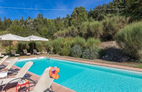 Next to the holiday villa in Tuscany is a private swimming pool with umbrella and deck chairs, surrounded by a green area equipped with table, chairs and barbecue.