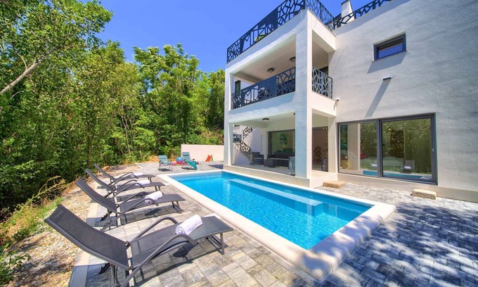 The detached villa is furnished in a modern and luxury style. The property is located on the outskirts. Also due to the view over woods from the property and its quiet and sunny hillside location the domicile is popular. Available for your exclusive use: sunbathing lawn, sun lounger, garden shower, barbecue facilities, terrace and garden furniture.LocationGrižane. The villa is located on a 200 sqm open forest plot. The landlord does not live in the house or on the property. Access is via a path (asphalted). Parking (for 2 cars) is available in a garage and on the street in front of the house. Specialair conditioning.Facilities: internet access (WLAN), iron and washing machine. TV reception takes place via satellite. PoolAll pools are available for exclusive use. Outdoor pool (usable from early May to mid October, heatable, 3 m x 7 m, depth 1,5 m). WellnessSauna and whirlpool. Leisurefitness equipment. Dogsallowed, EUR 35.00/pet per day. DistancesShopping 1000 m, restaurant 6 km, town center 3 km. Crikvenica: doctor 2,8 km, pharmacy 5,4 km and discotheque, bank each 6 km. airport in Omišalj 23 km. In summer: Adriatic Sea 6 km in Crikvenica (beach 6 km in Crikvenica featuring gravel and stones). dog beach in Crikvenica 6 km. DivisionVilla, 3 floors, 5 rooms (including 4 bedrooms), 280 sqm, in total 8 beds. RoomThe entrance to your villa is located on the ground floor, is at ground level and leads directly into the vestibule.Ground floor: Living room (20 sqm) with TV and access to the terrace (covered). Bedroom (16 sqm) with 1 double bed, TV and access to the terrace (covered, garden furniture). Bedroom (13 sqm) with 1 double bed, TV and access to the terrace (covered). Kitchen in the living room (15 sqm) with electric stove, fridge, electric kettle and access to the terrace. Bathroom (5 sqm) with washing machine, shower, 1 washbasin, WC and window. Separate toilet (3 sqm) with 1 washbasin, WC and window. 1st floor: Bedroom (17 sqm) with 1 double bed and TV. Kitchen (15 sqm) with dining area, electric stove, oven, extractor hood, dishwasher, fridge, microwave, coffee machine, toaster and electric kettle. Bathroom (5 sqm) with shower, 1 washbasin, WC and window. 2nd floor: Bedroom (30 sqm) with 1 double bed, TV and access to the balcony. Bathroom (15 sqm) with bathtub with shower facility, 1 washbasin, WC and window. Terms of lease and pricesIncluded in the priceOutdoor pool, air conditioning, parking place, sauna, electricity, gas, water, final cleaning, bed linen, hand towels, Wireless Internet access. Side costs-Costs on the spot:/Obligatory:registration fee 11 € per person per stay.