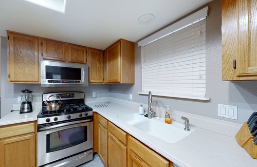 Inside, relax in comfort with central AC offering cooling respite from the heat. Challenge your guests to a few rounds of foosball in the living room or enjoy a family movie night on the wall-mounted smart TV. A gas fireplace offers cozy ambiance and added warmth for chilly nights. The bright, skylit kitchen is equipped with all the major appliances you'll need for at-home cooking.