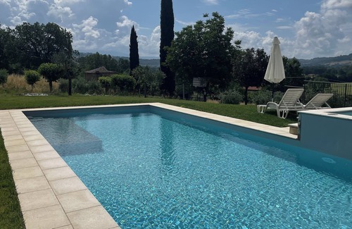 The villa has a barbecue and guests can enjoy the pool with a view to Todi and garden.