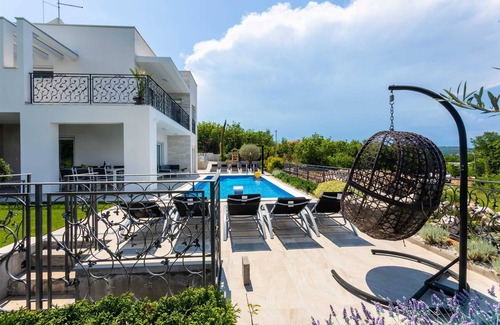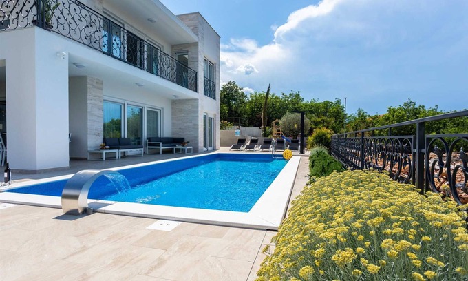 The beautiful Villa Zara***** with swimming pool, hot tub, and sauna is located in the small tourist town of Klimno on the island of Krk, which is far enough away from the tourist bustle, crowds, and traffic, but at the same time it is located near beautiful beaches and promenades where you can enjoy in summer days. The nearest beach is only 150 meters from the villa, and there are also shops, restaurants, and other facilities nearby that will complete your stay. Villa Zara, which is equipped according to the highest standards, extends over two floors and can host up to 8 people in four bedrooms with double beds, one of which contains a sauna, and consists of 4 bathrooms and a separate toilet, a spacious living room with a dining room and a fully equipped kitchen on the ground floor of the house. Here you can also find a hot tub that overlooks the terrace and garden. At the exit of the villa, there is a wonderful terrace with a view of the heated swimming pool and the sea, where you will surely enjoy the relaxing atmosphere and rest from your busy everyday life. Villa Zara is ideal to stay at any time of the year because it is fully air-conditioned and also has central heating, a romantic fireplace in the living room, a heated swimming pool, and a heated hydromassage tub. Villa Zara is perfect for your vacation and it is exactly what you deserve!