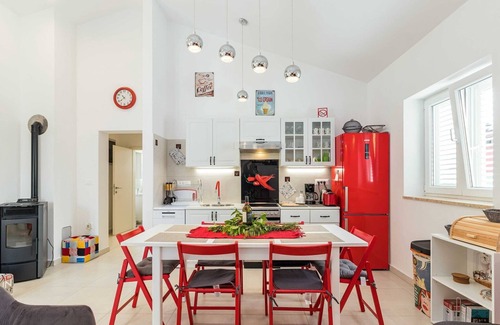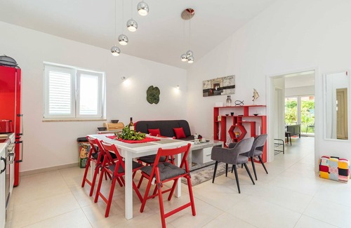 The villa in Premantura has 2 bedrooms and capacity for 6 persons (max. 4 adults). Accommodation of 100 m² homely and is fully-equiped, It has garden and swimming pool. The property is located 50 m city, 50 m from the restaurant, 200 m supermarket, 300 m bus station, 500 m rock beach "Munte", 11 km train station, 14 km airport and it is located in a a family-friendly zone and in the center of the city. The accommodation is equipped with the following items: garden, outdoor furniture, fenced plot, terrace, washing machine, barbecue, iron, internet (Wi-Fi), hair dryer, hot tub, air conditioning throughout the house, swimming pool private, open-air parking in the same building, 3 TVs, satellite tv (Languages: English). The open plan kitchen, of induction, is equipped with refrigerator, microwave, oven, freezer, dishwasher, dishes/cutlery, kitchen utensils, coffee machine, toaster, kettle, stove, kitchenware, plates and bowls.