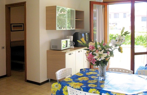Small resort "Villaggio Gelsomini", 2 storeys. 20 apartments in the residence. In the district of Bibione-Spiaggia 1 km from the centre of Bibione, 13 km from the centre of Lignano, 100 km from the centre of Venezia, 1.3 km from the sea. For shared use: property (fenced), garden with plants and trees, swimming pool (16 x 6 m, seasonal availability: 15.May. - 27.Sep.). Children's pool. In the complex: WiFi (extra). Bicycle rental. Public parking on the road. Supermarket 400 m, restaurant 650 m, bus stop 400 m, railway station "Latisana (Milano-Venezia-Triest)" 21 km, sandy beach 1.3 km, thermal baths "Bibione Thermae" 2.2 km. Golf course (18 hole) 11 km. Nearby attractions: Oasi Naturalistica Val Grande - Bibione. The owner does not accept any groups. Beach service: During summer season 1 parasol and 2 deck-chairs per apartment included in the price. Shuttle service: Within 23.05.-11.09. free shuttle bus to the beach section 'VUn Nuovo Posto al Sole' (daily every 30 minutes, from 8-19 h).