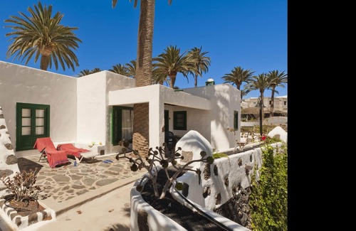 Villas Finca La Crucita spreads over a surface area of 7,500 square metres and is situated in the village of Haria, in the north of Lanzarote. Villas Finca La Crucita is surrounded by over 50 palm trees, the majority of which are over one hundred years old, and it is set in a valley in which thousands of these species. Villas Finca la Crucita with 3 bedrooms is equipped with 1 double King size bed,4 twins, 140 sq. villa, living room, 2 bathrooms, terrace, shared the outdoor pool with solar panels and **Pool heated in winter-time 01 October until 01. April**, Pre-paid air conditioning, free parking and free wifi in communal areas.