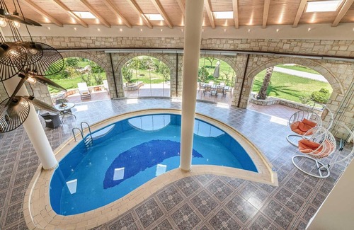 The ground floor consists of a comfortable and luxurious living room with a fireplace and an indoor BBQ, a dining area, the kitchen, a single bedroom and a WC. Villa Hermes has an indoor swimming pool providing privacy and comfort. On the first floor there are 3 double bedrooms en suite with hydro massage cabins and balconies with views to the beautiful gardens.