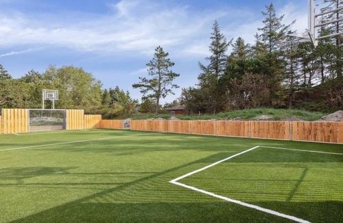 This luxurious holiday home on the picturesque island of Rømø comfortably accommodates up to 16 guests. The property features two separate sleeping areas, a large activity room, a pool area, and a variety of outdoor activities, making it perfect for large groups or families. The activity room is equipped for table tennis, billiards, and darts, and also includes a PlayStation and reading area. The pool area offers a refreshing swim and a counter-current system for fitness enthusiasts. The property also boasts an outdoor wellness area with a whirlpool and sauna on the terrace. The well-equipped kitchen and large dining area are perfect for meal times, with an outdoor barbecue and dining area also available. The property includes two sleeping quarters with three bedrooms and a bathroom each, plus a loft that can sleep up to four guests. Guests also have access to a large communal outdoor play area and multi-purpose court for various sports. The holiday home is conveniently located just 350 meters from the water on the eastern side of Rømø and 4 km from Lakolk Strand on the west coast.