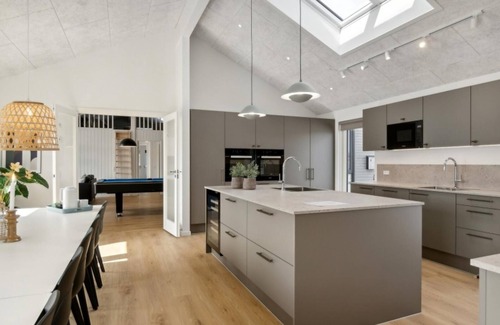 This text describes a luxurious holiday home in the scenic village of Ålbæk, near Skagen, known for its beautiful beaches and vibrant town life. The house can accommodate up to 30 people, making it ideal for large families or groups of friends. It features 12 bedrooms spread across four sections, one of which is a family room with a double bed and a bunk bed, with a bathrooms in each quarter, and an additional bathroom near the pool area. Two lofts provide extra sleeping space, particularly popular with children and young people.The house boasts an extra-large kitchen equipped with two of each essential appliance and a wine fridge. A long dining table in the living room provides ample space for communal meals. The living area offers numerous comfortable seating options.For entertainment, there\'s a large activity room with games like billiards, table tennis, darts, and table football. Wireless speakers throughout the house allow for a musical backdrop. The house also features a 23 m2 swimming pool with a water slide and counter-current system, an outdoor whirlpool, and a sauna. An outdoor shower is available for year-round use.The wooden terrace includes a luxury grill and garden furniture, and a lounge area for relaxation. Children can enjoy a playground with a sandbox, play tower, slide, and in-ground trampoline. The house shares a multi-purpose pitch with the neighboring house for sports like football, basketball, and volleyball. The house also has a charging point for electric cars, but guests need to bring their own cable.