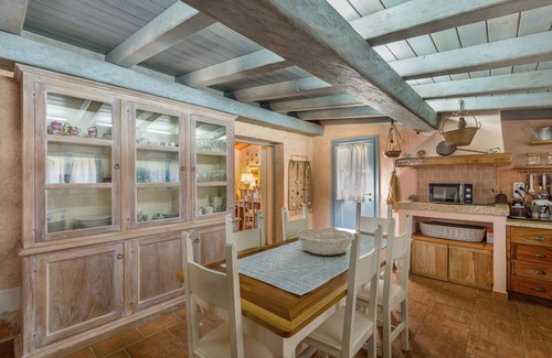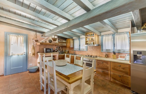 The main villa (150 square meters) can accommodate 6 people, and consists of 2 double bedrooms with private bathroom one with shower and one with Jacuzzi, 1 bedroom with two single beds and a bathroom with shower, large and comfortable living room with TV and DVD player, functional kitchen and well equipped, veranda overlooking the large garden with sofas and large outdoor table, on the outside of the kitchen some steps lead to the cellar where the washing machine is located. The large house has a dishwasher, fridge, kettle, toaster, microwave, coffee machine, crockery and various appliances. It has an underfloor heating & cooling system.