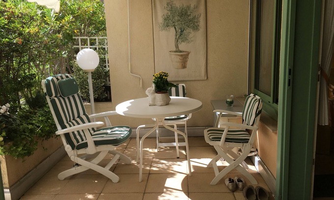 Nice little 25m2 apartment with 12 m2 patio with table and comfortable chairs, at 10 mins from the beaches and 10 mins from the French Institute on the other side.