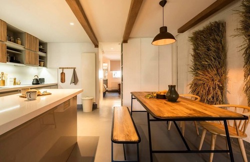 Vinci's original layout compliments the industrial loft-style decor. Enter into this 1 bedroom 85 square meter flat to find an open plan kitchen. The modern kitchen comes with all cooking utensils and appliances. The cabinets are finished with a mix of wood and gray.