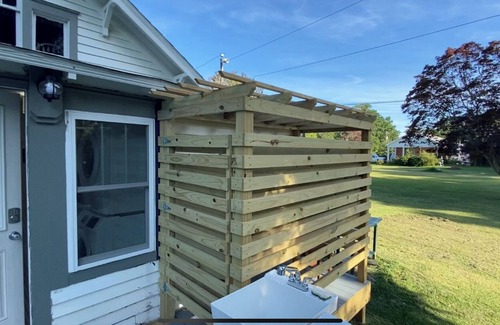 Upon entering Aunt Vid's cottage, you will be transported to an earlier era of tranquility on Roanoke Island. The family restored the original pine floors throughout the cottage. They renovated the kitchen while maintaining its vintage feel with basket-weave tile, a retro fridge, and butcher block counter-tops. The little cottage has a large front porch for enjoying the island breeze. After a day at the beach or fishing on the sea, the outside shower is a private, roomy spot in which to wash away the sand.