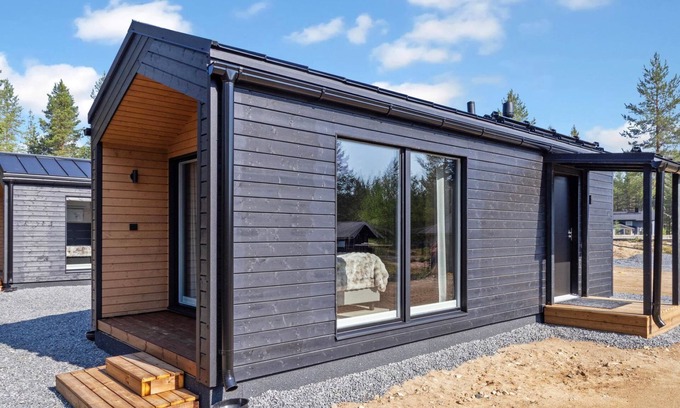 Built in 2025, the cabin has everything you need for a relaxing holiday. The combined living room/kitchen/sleeping area is practical and comfortable, and the bathroom includes a shower and WC. The sleeping area features a 160 cm wide bed for two. Large windows and a covered terrace bring the scenery into your stay. Heating is provided by underfloor heating and an air source heat pump, keeping the cabin comfortable in both winter's cold and summer heat.
