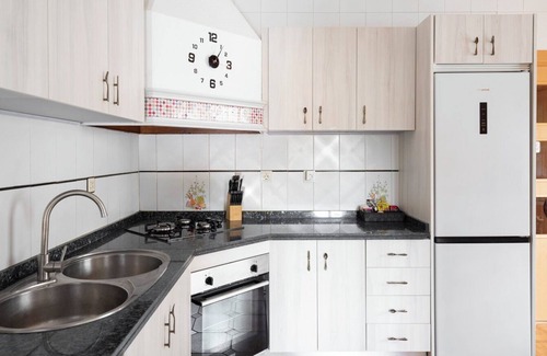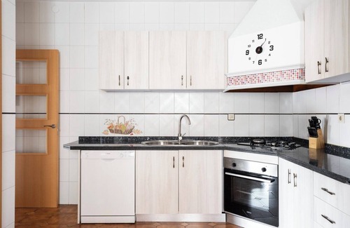 The kitchen is spacious and comfortable, very well equipped and with all appliances (dishwasher, oven, microwave, etc.). It contains a dining area next to a bright window. Next to the kitchen we have a bathroom with a washing machine and a pantry.