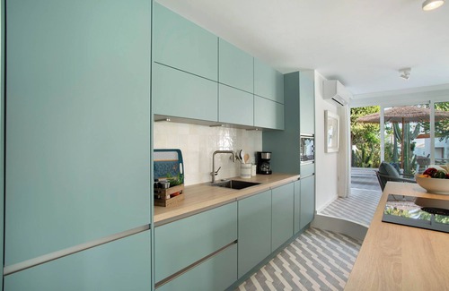 The accommodation is of high quality and individually furnished, designed to make you feel completely at ease. Much of the furniture was crafted by a local carpenter, adding to its unique charm. A special highlight is the private roof terrace with a sunbathing area and a bar equipped with a fridge. Guests also have access to a separate, tastefully landscaped garden with mature trees and sunbathing areas. Each bungalow includes its own cozy terrace and private patio. The spacious, 11-square-meter pool is exclusively shared between the two bungalows, ensuring privacy and relaxation.