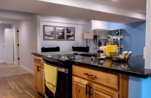 Like a hotel suite, but with all the extra amenities including a full kitchen (with all the cooking utensils you need), full laundry, and space for 6 people. This apartment has wonderful natural light at almost every time of day, multiple sitting areas so you don't feel cramped, and some of the softest towels on this side of the Rocky Mountains.
