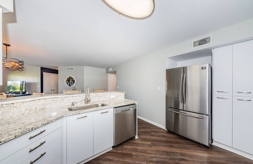 Enjoy a fun-filled island vacation in this stylishly updated, 1st floor island/golf course villa in Vista Verde North. The gorgeous, gourmet kitchen boasts modern stainless appliances, granite/stone counter tops, large pantry and cabinets galore ~ all well-stocked with an abundance of kitchen essentials. Comfy living and dining area furnishings; convenient breakfast bar; stunning plank-style floors; remodeled bathrooms both with walk-in showers, flat screen TVs in every room and wireless internet service round out the amenities in this fabulous unit. After a full day of sight-seeing adventures or fun in the sun on our beautiful Gulf beaches, come home to the peacefulness of the island and relax on the patio with afternoon cocktails and quick snack before heading out for the evening. Take time to enjoy the sparkling, heated pool or rejuvenate in the spa. While on the island, walk, jog or bike Isla’s quaint Spanish-named streets which meander through lush gardens surrounded by royal palms, ponds and waterways. Isla is also just minutes from Fort DeSoto State Park and Fort DeSoto’s renowned North Beach. Don’t miss out on the area's local restaurants and unique shops up and down our beautiful coastline, as well as fishing charters, golfing, boating, nightlife, sunset cruises and more. Paradise at its best ~ Isla del Sol!