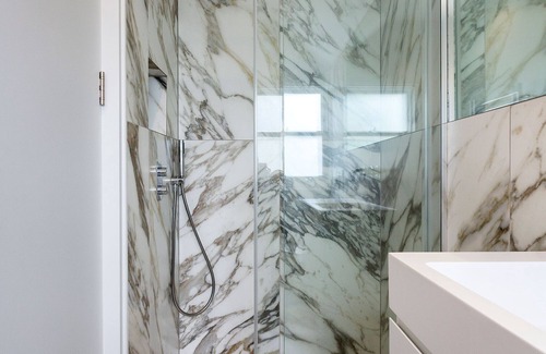 Deft skylights shower the open-plan kitchen and dining space with an abundance of light, intelligently accentuating the inviting family living space that awaits within. Serene pendants and accent lights bring a harmonious atmosphere to the spacious modern kitchen, complete with a marble breakfast island that guides you to the formal dining space and reading nook.