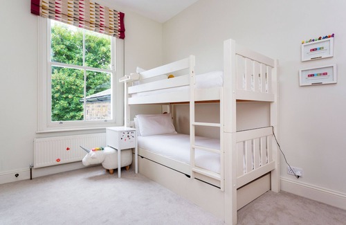 Distinguished cornicing and high ceilings preserve a sense of period charm in the double-aspect reception spaces, incorporating designated TV and music rooms. Neutral hues are paired against a warming ornate fireplace and stylish sash windows to create an atmosphere of relaxation in the principal bedroom. The cosy single suite leans towards the contemporary with a stylish marble en-suite bathroom. Kids can settle in for an early night in the second bedroom, equipped with a bunk bed and play area. Offering four bedrooms in total and a further family bathroom, this property is a superlative staging post for the whole family to explore the best of north London.