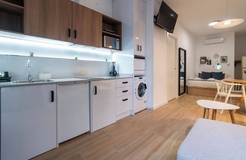 The studio features a spacious and comfortable double bed, strategically positioned to ensure restful sleep. A separate closet/dressing area provides privacy from the main space. The living room is equipped with a chaise-longue sofa bed and a dining table for four, ideal for enjoying a homemade meal or relaxing in front of the TV. The minimalist and well-organized decor invites you to disconnect and recharge.