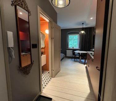Food & DrinkTea/Coffee maker, Bottle of water, Chocolate/CookiesBathroomFree toiletries, Toilet, Toilet paper, Body soap, Towels, Hairdryer, Shower, Bathtub or shower, Shampoo, Slippers, Private bathroomMedia & TechnologyTV, Flat-screen TV, Streaming service (like Netflix)GeneralHeating, Trash cans, Hardwood or parquet floors, Fire extinguisher, Ironing facilities, Fan, Iron, Smoke AlarmKitchenDining table, Kitchenette, Kitchen, Electric kettle, Wine glasses, Refrigerator, Kitchenware, Stovetop, Cleaning productsViewView, City viewLiving AreaDining areaBedroomWardrobe or closet, LinensBuilding CharacteristicsPrivate apartment in building, DetachedRoom AmenitiesHypoallergenic pillow, Clothes rack, Non-feather pillow, Socket near the bedAccessibilityRoll-in shower |