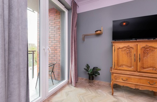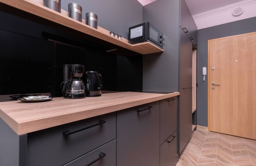 The carefully designed interior of the studio apartment is suitable for 4 people. The space of the apartment offers a spacious living area with a kitchenette and a bathroom with a shower. A fully equipped, tasteful studio distinguished by a modern design and careful interior finishing. The dark colors of the apartment and the use of pastel pink in the bathroom, as well as high-quality equipment emphasize the atmosphere of the apartment. The sublime and aesthetic interior with many amenities (dishwasher, coffee maker, microwave oven) ensures maximum comfort of your stay. The apartment has a spacious balcony, equipped with garden furniture.