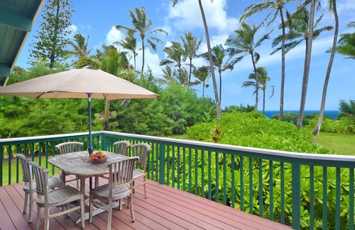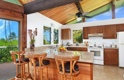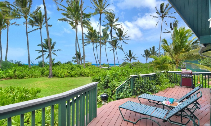Lush, tropical foliage and spacious grounds surround this delightful, beachfront home. It exemplifies the tranquillity for which Kauai's north shore has long been valued. Vaulted ceilings add a spacious feel to the large living area which offers fabulous ocean views. Amid gentle breezes, the lanai is a wonderful place to relax and enjoy nature's impressive panorama and spectacular sunsets.