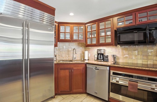 The stylish interior is furnished with solid collectable hardwood pieces by renowned interior designer Philpot's and Associates, complimented by the Merbau hardwood crown molding and doors throughout. The stately kitchen has a Wolf glass cooktop and oven, Sub-Zero refrigerator, GE profile microwave, Fisher Paykel dual dishwasher drawers, granite counter tops, African Mahogany cabinets, along with three full bathrooms surrounded with Peruvian Travertine stone. Enjoy the clean design and convenient location, with the beach and countless Kaua’i adventures just steps from your front door.