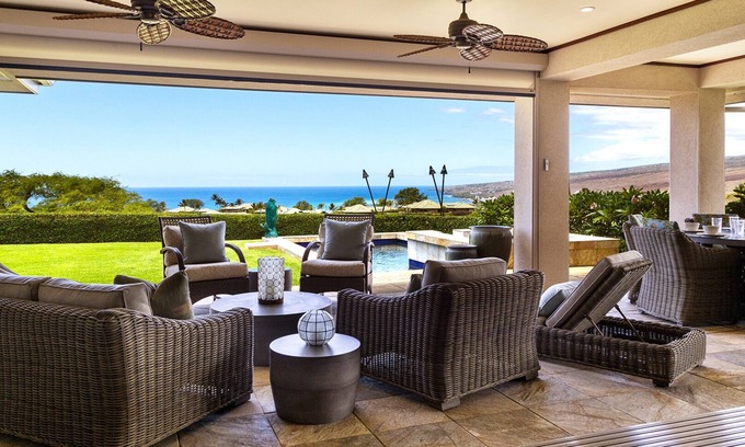 Recently updated with a new Subzero, Bosch dishwasher, and Wolf microwave, the professional decorated great room kitchen combination expands to the large lanai with brand new Restoration Hardware furniture for lounging and dining. The Wolfe BBQ and outdoor kitchen maximize the Aloha experience with outdoor ocean view dining layered by the 14th hole of the Westin Hapuna golf course. The lawn is large enough for family play and inviting for small children to enjoy along side of the newly resurfaced pool. The updated electric lanai shade offers cover as the sun sets during late afternoons. Additional home offerings include a large laundry room, guest half bath, and wine cooler and wet bar in the kitchen.