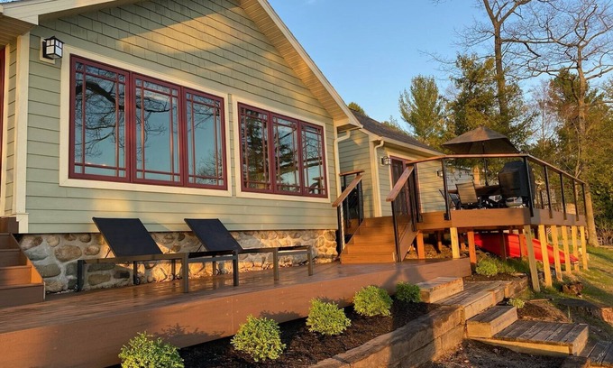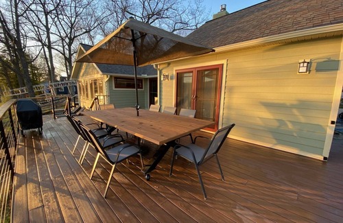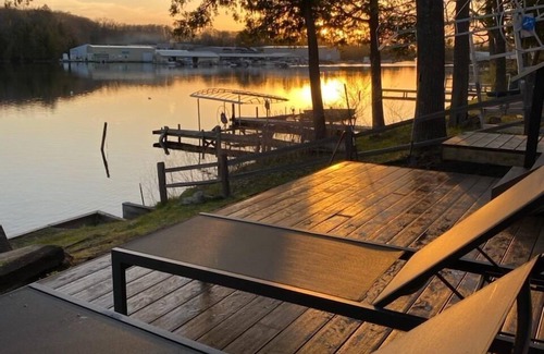 An expansive deck and permanent dock offers lots of space for sunning & lounging! Grill a lovely meal to eat overlooking the water or have a drink on the loungers! In the evenings, cook smores over a campfire and watch the beautiful sunset on the water!