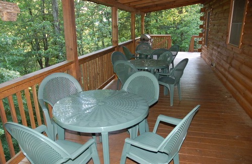 Walch Creekside Log Cabin Retreat sits on a Smoky Mountain at 4,400’ in a natural park setting on two acres in Maggie Valley. Maximum Guests 12 (No Additional Guest Allowed in Cabin, Decks or Grounds). This three story cathedral ceiling log cabin is 2,800 s.f. and has one king size bed in a master suite with private bathroom with whirlpool tub, one double futon in a loft off the master suite, two private bedrooms with queen size beds on the main level with shared hall bathroom, and in a large sleeping/den area a full futon sofa, two twin top & two double bottom futon bunk with a full bathroom. The cabin sits at over 4,000 feet elevation and has a central heat system but NO AIR CONDITIONING SYSTEM. To help circulate the cool mountain air, each room has a ceiling fan and all windows have screens.