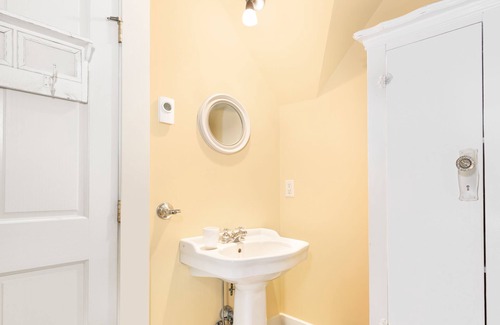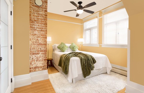 Cheerful marigold walls and exposed brick invite you into Stirling Condo, located on the second floor of historic Cadder House. The serene bedroom is furnished with a queen-size bed and a white shag rug. A private den doubles as a guest room with French doors and a day bed. With a full-size sleeper sofa in the stylish lounge, the condo sleeps five guests.