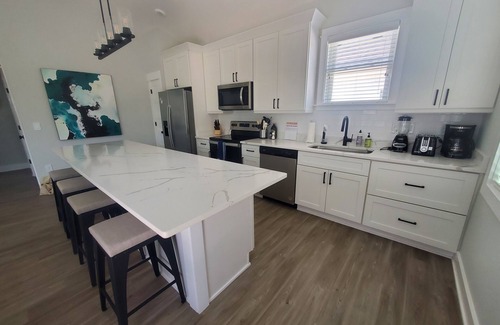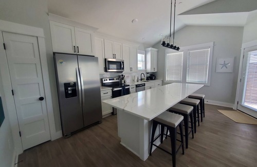 The living space features an 8-foot island, with plenty of space to enjoy dinner with family and friends, play games or work remotely! It also features a fully stocked kitchen, with a dishwasher, blender, coffee pot/maker and plenty of cookware. A washer/dryer is located in the hallway closet. There is a private patio in the front where you can let towels dry after a long day at the beach. A grill and outdoor shower are also available on the side of the unit.