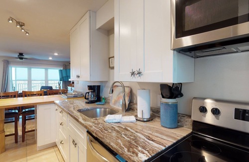 Check into relaxation in this totally remodeled second-floor condo which sleeps six. Rattan furniture and comfy cushions in the living room keep you comfortable while watching the flat-screen TV or looking out to the Gulf of Mexico. The cozy kitchen has all the appliances, utensils, and dishes you need to enjoy your stay. Stainless steel appliances to modernize your cooking needs. Lining the kitchen is the bar area for dining. You can go out the door to step onto the private balcony which overlooks the yard and has Gulf views. See it all from chairs on the balcony, whether you want to watch a game of sand volleyball or see the seabirds diving in the waves. The rolling dunes are peaceful. Back inside, the master bedroom (BR1) has two queen-sized beds and an attached upgraded bathroom. The décor abounds with beaches and shells. Tropical ceiling fans keep you cool throughout the day and night in all the rooms. The second bedroom (BR2) has one queen-sized bed. All the bedding matches with quaint coastal designs. The second bathroom has an upgraded sink and shower. Amenities include: TV, Wi-Fi, access to Charcoal BBQ pits and picnic areas, laundry facilities, 2 Boardwalks to the Beach, 2 Shared Community Pools. Located near downtown Port Aransas, you have easy access to the golf course, shopping, restaurants and entertainment.