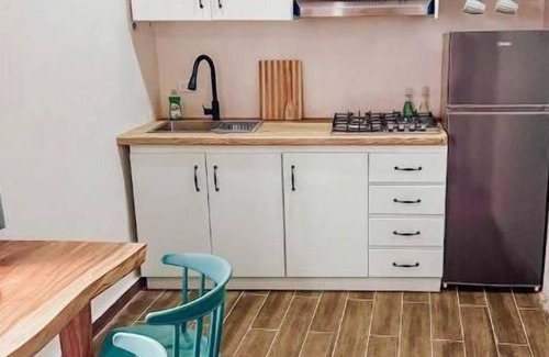 A cozy space for upto two people. Entrance is off a courtyard, passing the pool and patio area. This apartment is well equipped with wifi, a live edge dining table, quiet living room space, and has a loft style aluminum roof with exposed roof rafters
