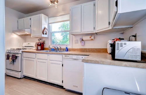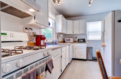 Experience the best of outdoor living in the home’s large fenced-in backyard, surrounded by towering trees and an expansive lawn, which is manicured weekly yby expert landscapers and watered automatically. Spend summer afternoons relaxing on the private patio, which comes complete with comfortable chairs and a gas grill for entertaining barbecues. You and your companions will love preparing home-cooked meals in the fully equipped kitchen, well-stocked with modern glasses and plates, a refrigerator with ice and water dispensers, Keurig coffee machine, toaster, gas cooktop, microwave oven, self-cleaning oven, large sink with garbage disposal and a stainless steel interior dishwasher. When your family dinner is complete, gather around the dining room table with seating for 6 people to enjoy your culinary masterpiece. 3 guests can spend meals at the quaint butcher block table in the kitchen.