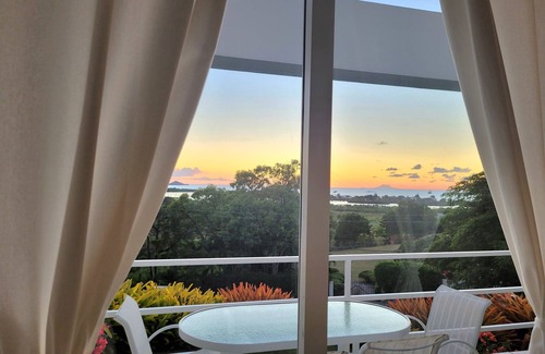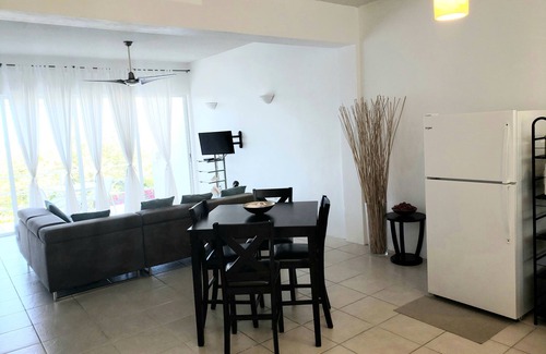 Stay in a spacious modern furnished 2 bedroom 2 Bathroom suite with beautiful views of the Caribbean Sea and the most relaxing sunsets. Dine on the balcony and watch the sunset and the most beautiful rainbows. Walk or drive to the beach. It's truly a relaxing and easy space.