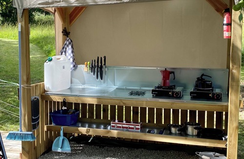Communal area: The camping/glamping area also has a communal summer house kitchen within the orchard. This contains a fridge, hot and cold running water, sink, drinking water, double electric hob, fridge, iron, ironing board, hairdryer, manual washing machine, table and chairs, and a recycling zone.