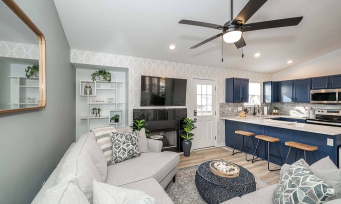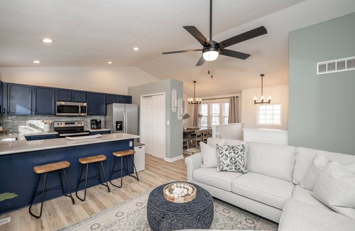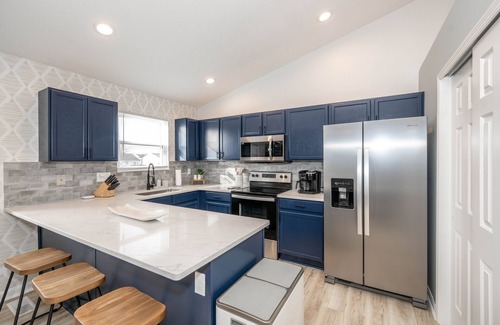 The home’s bright and fresh interior is adorned with contemporary furnishings set against modern décor, creating spaces as suitable for relaxation as they are entertaining. Kick up your feet on the plush living room sofa as you stream a movie or episodes of your favorite shows on the mounted smart TV. The centerpiece kitchen showcases stainless steel appliances, glossy stone counters, and striking deep blue cabinetry stocked with all the conveniences of home. Gather for meals together at the sophisticated dining room table with seating for 10 or enjoy meals at the go perched up at the counter with high-top stool seating for 3. Pool sharks and beginners alike will want to make their way to the garage-turned-game room, where a pool table awaits to host hours of competitive fun.