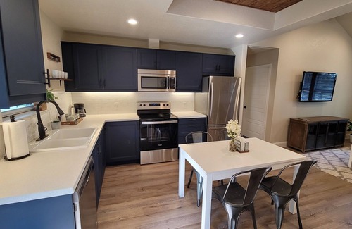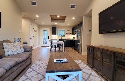 This hill country/modern style 2 bedroom, 2 bath house includes a breezy covered porch, fully stocked kitchen with a coffee bar, complementary snacks and drinks, pantry, dining room, TV’s with Netflix, Wi-Fi and full size washer and dryer, making it the perfect option for a longer stay, business travel or a romantic getaway! Master Bedroom with new King size bed.
