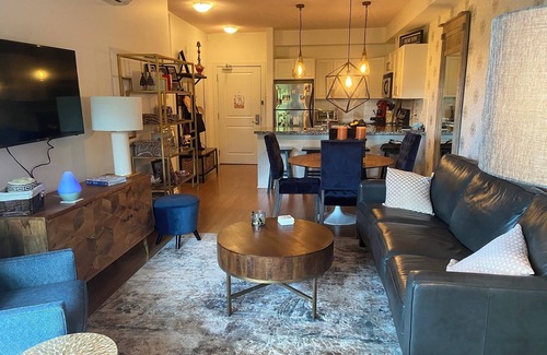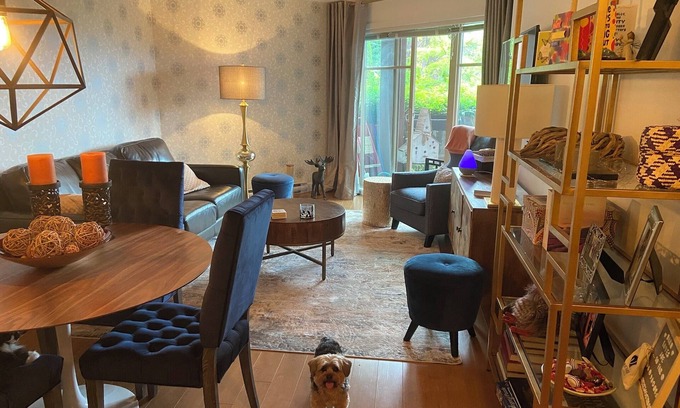 My home is very crafty and filled with pieces I've created. It is not suitable for small children. I live alone with my dog and cat. The closets are filled with my personal things, but I have made space for my guests' comfort.