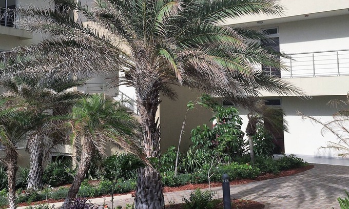 Beautiful landscape with palm trees and foliage on the property. Sun loungers are provided surrounding a gorgeous pool. Dedicated parking space. Secure gated condominum and daytime grounds keeper.
