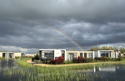 Our modern and light-filled chalet for 4 people is located on a beautiful property surrounded by a man-made waterway. The property is fully fenced, making it perfect for a relaxing holiday with young children or dogs. The spacious terrace is equipped with garden furniture and sun loungers. The magnificent view over the water and reeds invites you to enjoy long summer evenings on your own property. A private jetty for sunbathing and relaxing can be accessed via a gate from the garden. The spacious living and dining area with TV and air conditioning features a high-quality kitchen with a dishwasher. There are two bedrooms with double beds and wardrobes. The larger bedroom with TV offers a beautiful view of the water from the bed. Both bedrooms have fly screens on the windows. A washing machine and dryer can be used for a fee in the lobby.