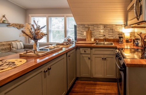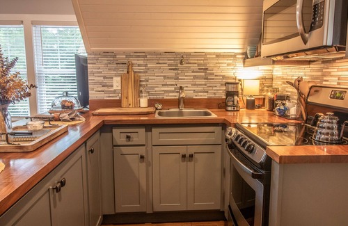 Start the day brewing coffee in a cheerful kitchen with vivid wood surfaces and a breakfast bar. This cozy, open-plan carriage house offers endless warmth by way of its modern furnishings and charming decor, all under a paneled gable ceiling.