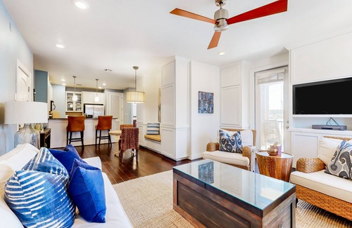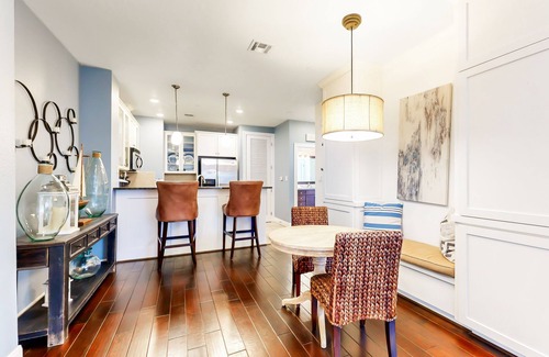 Sun-kissed and happy, the interior of your stay will provide a warm welcome from the moment you walk inside. Enjoy each other's company with ease amidst the open living room, dining room, and kitchen. When you aren't dining out, the kitchen's stainless steel appliances and ample meal prep space are prepared to host all of your culinary creations.