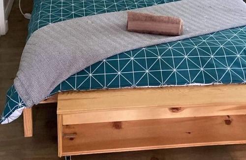 Haven of peace in the heart of nature, this 2 bedroom chalet with pullout couch, perfect for relaxing and is located on the edge of a small lake that is very quiet, surrounded by trees and friendly animals. Enjoy the lake, take a swim or just let your feet feel the cool water.
