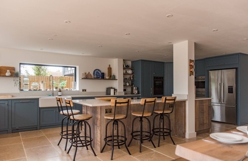 Huge (70sq m plus) kitchen and dining room, open living area with a large kitchen island and 6 counter stools. 2 x 90cm wide ovens, 2 x 4 area induction hobs, 2 x dishwashers, large fridge freezer with integral ice maker and chilled water dispenser, further 36 bottle wine/beer chiller, large warming drawer integral microwave, Quooker instant boiling water tap, Barista style coffee machine / Nespresso with original pods, packed with crockery and glassware and heaps of extras for even the most ambitious chef.