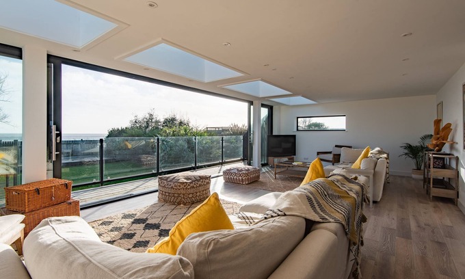 Large open plan living room with magnificent views of the beach and sea over the garden, with two three seater sofas, armchairs, floor cushions. Large Smart screen TV. Corner breakfast table and seating for 6. Bar area, with fridge, sink and glassware.